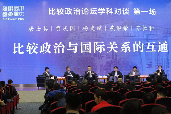 开幕式后举行的“比较政治学科对谈”第一场主题是“比较政治与国际关系的互通”,由北京大学国际关系学院副院长归泳涛副教授主持,北京大学国际关系学院院长唐士其教授,全国政协常委、北京大学国际关系学院前院长贾庆国教授,中国人民大学国际关系学院院长杨光斌教授,北京大学政府管理学院常务副院长燕继荣教授,复旦大学国际关系和公共事务学院执行院长苏长和教授参与对谈。
