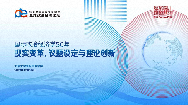 2021年12月26日,由北京大学国际关系学院主办、国际政治经济学系承办的北大国关全球政治经济论坛顺利召开。本次论坛是北京大学国际关系学院“北大国关学术论坛”(SIS Forum PKU)系列活动的第三场大型学术活动。论坛主题为“国际政治经济学50年:现实变革、议题设定与理论创新”,共分为主旨演讲与专题研讨两个主体环节,校内外40余名专家学者齐聚线上,围绕全球政治经济的变革和危机以及国际政治经济学的发展趋势等方面,通过视频会议形式展开了深入的交流与讨论。全天共有超过1300人次的国内高校师生与研究单位学者与会旁听。