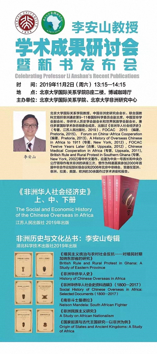 北京论坛经过16年的发展,已成为北京和中国的一个重要国际学术交流平台,具有广泛的国际影响力。如何充分利用北京论坛这个高端学术平台,扩大国际关系学院的学术影响力一直是国际关系学院思考的重要课题。今年,国际关系学院采取了一个新的举措,在北京论坛期间重点集中推出国际关系学院老师的最新成果。11月2日下午国际关系学院和北大非洲研究中心在国际关系学院咖啡厅举办了一场李安山教授学术成果研讨会,庆祝李安山教授今年出版九部学术著作。国际关系学院院长唐士其教授专程出席。李安山教授今年出版的九部著作,包括《殖民主义统治与农村社会反抗——对殖民时期加纳东部省的研究》、《非洲华侨华人史》、《非洲华侨华人社会史资料选辑》、《南非斗士曼德拉》、《非洲民族主义研究》、《国家起源与古代王国研究—以非洲为例》和《非洲华人社会经济史》(上、中、下三册)。其中,前六本已经出版,是修改、辑集和再版,三卷本的《非洲华人社会经济史》则是李安山教授今年重量级的新著。此次活动反响热烈,产生了良好的社会效益。