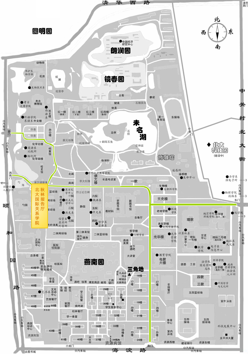 乘出租直达北京大学机动车门,经预约可进入,进来往东走100米右转到达北京大学国际关系学院