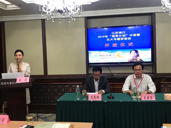 2019年5月14日,北京大学江苏银行股份有限公司领导力创新与管理能力提升培训班在英杰交流中心顺利开班。北京大学国际关系学院党委书记虎翼雄,江苏银行总行党委委员、副行长、董事会秘书吴典军以及北京大学江苏银行股份有限公司领导力创新与管理能力提升培训班全体学员出席了开班仪式。开班仪式由北京大学国际关系学院继续教育办公室副主任杨莉主持。