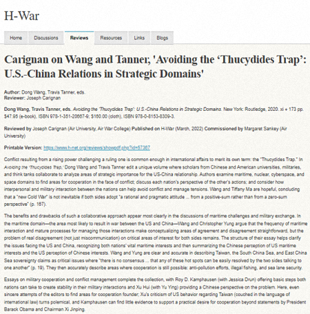 Citation: Joseph Carignan. Review of Wang, Dong; Tanner, Travis, eds., Avoiding the ‘Thucydides Trap’: U.S.-China Relations in Strategic Domains. H-War, H-Net Reviews. March, 2022. URL: https://www.h-net.org/reviews/showrev.php?id=57367