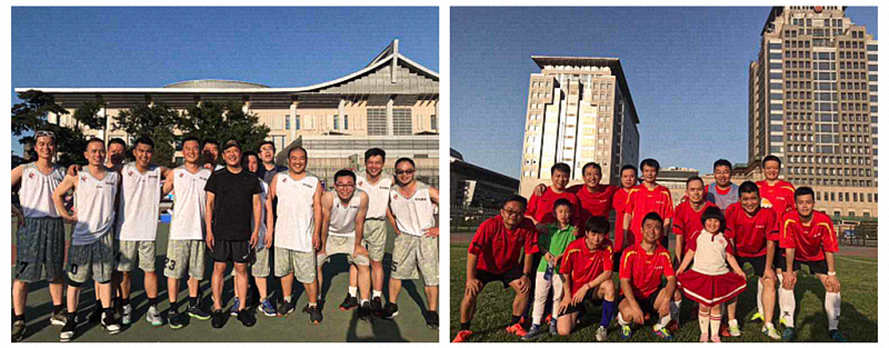(工会篮球队、足球队合影,左图中间黑色衬衫、右图后排左二为王老师)