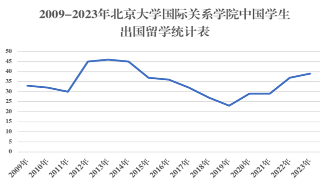 “以西方之学术,灌输于中国,使中国日趋文明富强之境”,这也是几代北大国政学人的夙愿。学院千方百计创造条件,鼓励学生读万卷书、走万里路,既从中国看世界,也从世界看中国。美国康奈尔大学、宾州大学,瑞士日内瓦高研院,丹麦社会科学学院,波兰华沙大学,日本东京大学、早稻田大学、新潟大学,泰国法政大学….到处都留下了国关学子的身影。准确统计改革开放以来北大国政系赴海外学习的人数是本文无法完成的任务,本文提到的人和事仅限于个人了解,难免挂一漏万。近些年,北大国关学院仍保持了较高的中国学生出国深造比例。据统计,2009-2023年,国关学院选择海外留学的中国学生人数为520人,平均每年约35人(见图4)。目前北大国际关系学院的所有教研人员,也均有在海外留学或者长期进修的背景,构筑了一个坚实的国际化师资队伍。