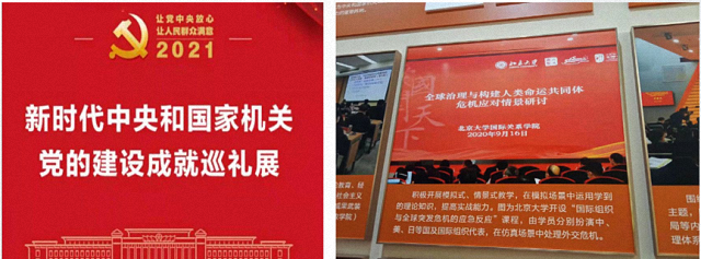 在教学改革和创新方面,国际组织与国际公共政策系经过前期研讨和筹备,在借鉴博弈论和军事推演方法的基础上,与国防大学、军科院等单位的资深专家合作,将情景发展式研讨教学方法(Scenario Development Discussion, SDD)应用到以国际组织和国际公共政策课程为代表的实务型教学课堂中,为本科生和研究生提供一种真实的多边外交和谈判场景,激发本科生和研究生的学习兴趣,提升学生处理多边外交和国际危机的实际工作能力。情景发展式研讨教学是一种较为新颖的研讨和教学方式。在流程导控的前提下,各行为体通过参与情景(场景)模拟、角色分工扮演和沉浸式互动研讨的方式进行案例解读和研究,使政策评估和分析更趋近于真实,有助于检验各种政策的有效性,丰富预案的完备性。该教学方法的应用受到学生的普遍欢迎。2021年该教学成果被评为北京大学教学成果一等奖。最近四年,我们又将该教学方法应用于中央国家机关司局级干部专题研修班的教学之中,受到干部学员们的高度肯定和热烈欢迎。该成果作为中央和国家机关干部教育培训的优秀典型案例,入选2021年7—8月由中央和国家机关工委主办的“新时代中央和国家机关党的建设成就巡礼展”,在国家博物馆进行了隆重的成果展出。