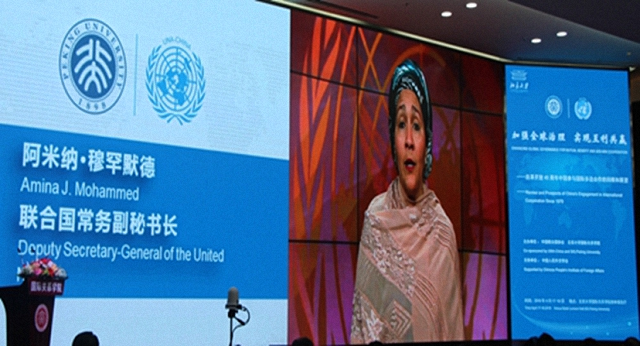 2018年4月18日,联合国常务副秘书长阿米纳·穆罕默德在国际关系学院与中国联合国协会于北京大学联合举办的国际组织人才培养论坛上视频致辞。