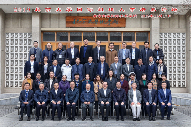 2019年11月16日,原国务委员戴秉国(前排左5)、北京大学校长郝平(前排左6)与出席2019年北京大学国际组织人才培养论坛的部分嘉宾合影。