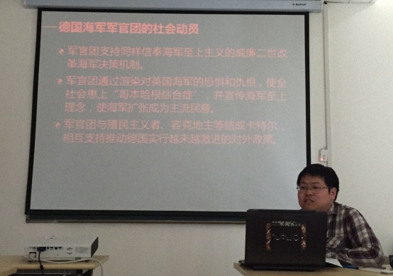 陈永同学就“一战”前英德海军关系急剧恶化、掀起军备竞赛和英美海军关系逐渐好转、最终结盟问题,从它们各自的海军军官团为建设海军所进行的社会动员角度进行了解释。在陈述中,陈永提出了海军军官团社会动员的一般程式,阐述了美国和德国海军军官团的一般特征、海军决策机制。然后,陈永着重陈述了美德海军军官团的动员过程,及其产生的国内和国际政治后果。最后,陈永坦陈现在研究存在的不足,并就研究中存在的疑惑和困难向两位老师请教。