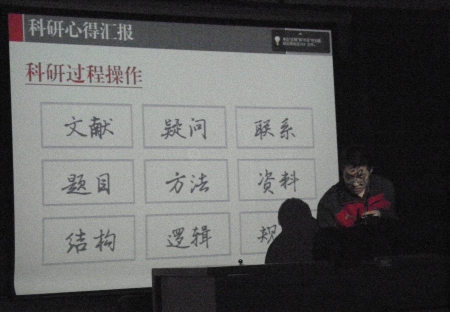 大会第一阶段,王逸舟老师首先代表学院对广大博士生同学提出了十项意见,期望博士生同学认真严肃对待学习和研究工作,鼓励同学们多读书、坚持写作、积极承担学院各研究中心与导师的课题研究项目,并活跃于不同的学术交流活动中;其后,王逸舟老师宣布并强调了学院对于博士生论文预答辩环节进行匿名评审的新举措,希望博士生同学严格要求自己,为自己的博士生涯交出一幅满意的答卷。接着,潘荣英老师为大家介绍了各类博士生奖学金项目的申请要求,王栋老师分享了在美国读博士期间的研究经历和后来研究工作中的感悟。同时,2011级的博士生余忠剑和2013级博士生刘毅同学也就发表文章和参与科研工作的经历分享了个人经验和体会。