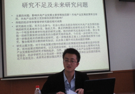 2013年12月6日下午,北京大学国际关系学院博士生论坛第39期活动在C105教室举行。2010级国际关系专业博士生吴雁飞同学做了题为《风电产业发展政策:研究路径、议题及不足》的主题报告,宋伟副教授参与了本次论坛活动,十余名博士生参加了互动讨论。