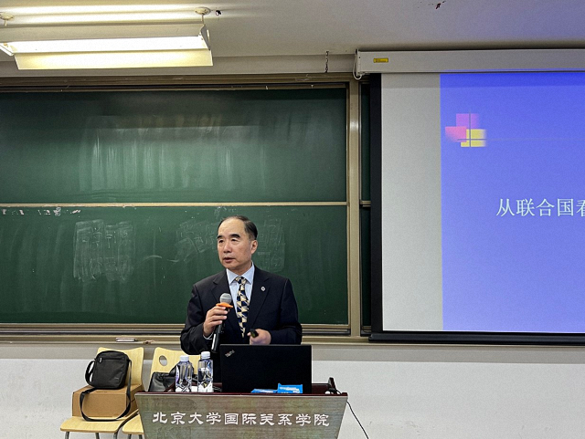 2022年9月27日晚,北京大学国际关系学院《国际组织与全球治理前沿名家讲座》课程第三讲于北京大学国关楼C307教室举行。中国常驻联合国代表团前参赞、外交部国际司前处长、外交部礼宾司前副司长、中国驻瓦努阿图共和国前特命全权大使、现任中国亚欧会议大使、中国联合国协会常务理事谢波华大使为同学们带来了题为《从联合国看中国的大国崛起》的精彩讲座。国际关系学院副院长兼国际组织与国际公共政策系系主任张海滨教授致欢迎辞,陈沐阳助理教授主持讲座,来自国际关系学院、法学院、光华管理学院、历史学系、软件与微电子学院、信息科学技术学院、社会学系、外国语学院、新媒体研究院、新闻与传播学院、燕京学堂、艺术学院、医学部等北大不同院系的百余名本硕博学生参加了讲座。