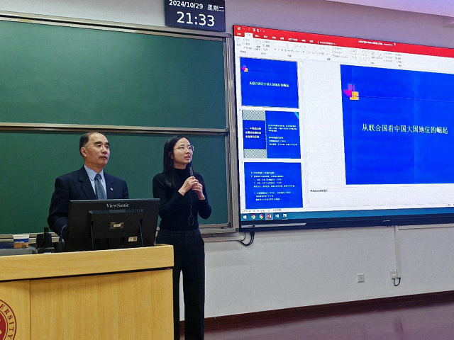 谢波华大使以历史进程为主线,回顾了中国近现代百年历史,勾勒出中国成为联合国创始国的背景和进程,展现了新中国建立后在联合国的外交风云。在讲座的第一部分,谢大使讲述了中国近代内忧外患的屈辱历史,分析了中国外交由半殖民地半封建情况下的旧式外交向近现代外交的转型历程。在第二部分中,谢大使探讨了抗日战争对于二战胜利和联合国成立的重要推动作用。在第三部分,谢大使展现了中国在冷战时期利用联合国平台开展外交活动的风风雨雨,并结合一手资料,还原了外交博弈的重要场面。他通过对中国恢复联合国合法席位的艰难过程的详细论述,让同学们对于一些不为人知的外交风云故事有了更深入、直观的理解。