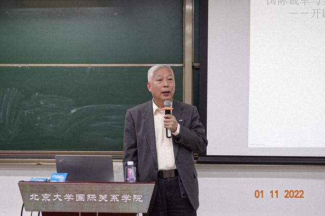 2022年11月1日晚,北京大学国际关系学院《国际组织与全球治理前沿名家讲座》课程第八讲于国际关系学院C307教室举行。国际禁止化学武器组织外联司前司长、联合国秘书长生化武器调查团中国专家、中国联合国协会前副会长兼总干事、现常务理事刘志贤为同学们带来题为“国际裁军与全球安全——开辟一个没有化学武器的新世界”的精彩讲座。学院副院长兼国际组织与国际公共政策系主任张海滨教授致欢迎辞,陈沐阳助理教授主持讲座。来自国际关系学院、法学院、光华管理学院、历史学系、软件与微电子学院、信息科学技术学院、社会学系、外国语学院、新媒体研究院、新闻与传播学院、燕京学堂、艺术学院、医学部等北大不同院系的百余名本硕博学生参加了讲座。