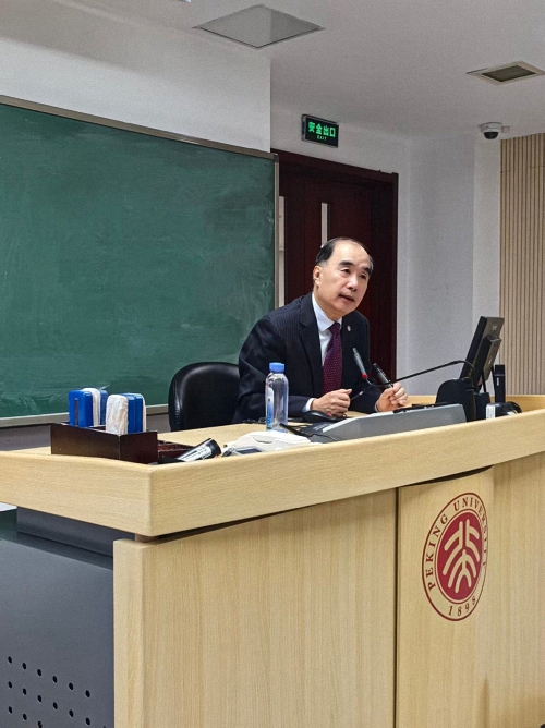 2025年9月23日晚,北京大学国际关系学院举行《国际组织与全球治理前沿名家系列讲座》第二场讲座。中国驻瓦努阿图共和国前特命全权大使、现任中国联合国协会常务理事谢波华大使以“从联合国看中国大国地位的崛起——纪念联合国成立80周年”为题,与同学们分享了中国和联合国关系发展的历史脉络。来自国际关系学院、计算机学院、政府管理学院、新闻与传播学院等十多个院系的近200名中外本硕博学生参加了此次讲座。学院助理教授吴昊主持讲座。讲座开始前学院副院长、国际组织与国际公共政策系系主任张海滨代表学院向谢大使表示感谢。