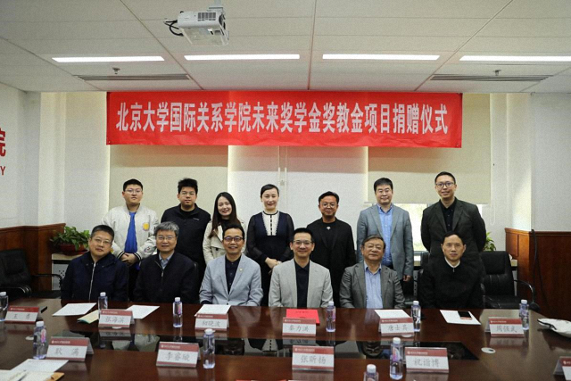 On the morning of April 29, 2023, the donation ceremony for the Future Scholarship and Teaching Award was held in Room B117 of the School of International Studies (SIS), Peking University. Alumni representatives Mr. Qin Lihong (Co-founder of NIO), Mr. Zhou Qiangwu (Vice President and CEO of the New Development Bank), and Mr. Wang Yong (Deputy Secretary-General of the Peking University Education Foundation) attended the ceremony. The School was represented by Dean Prof. Tang Shiqi, Party Secretary Prof. Chu Xiaobo, Vice Dean Prof. Zhang Haibin, Deputy Party Secretaries Prof. Zhu Yibo and Prof. Xiang Zuotao, Assistant Dean and Director of the Alumni Office Prof. Zhang Xinyang, and Deputy Director of the Alumni Office Ms. Jin Rui. The ceremony was chaired by Prof. Xiang Zuotao.
