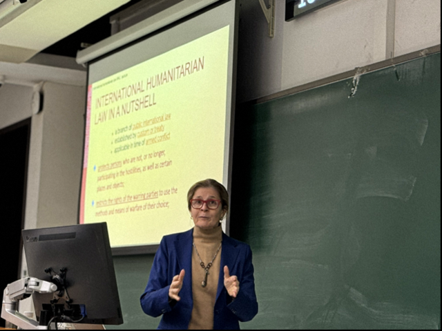 At the beginning of the lecture, Ms. Piccoli introduced the basic concepts of international humanitarian law (IHL). As a branch of public international law established through custom or treaties, IHL applies in times of armed conflict. It aims to protect persons and objects not participating or no longer participating in hostilities and to restrict the arbitrary choice of means and methods of warfare by belligerents. The origins of IHL date back to the Battle of Solferino in 1859, when Swiss businessman Henry Dunant, witnessing the horrors of war, mobilized local residents to assist the wounded. This experience led to the founding of the ICRC and the emergence of IHL.