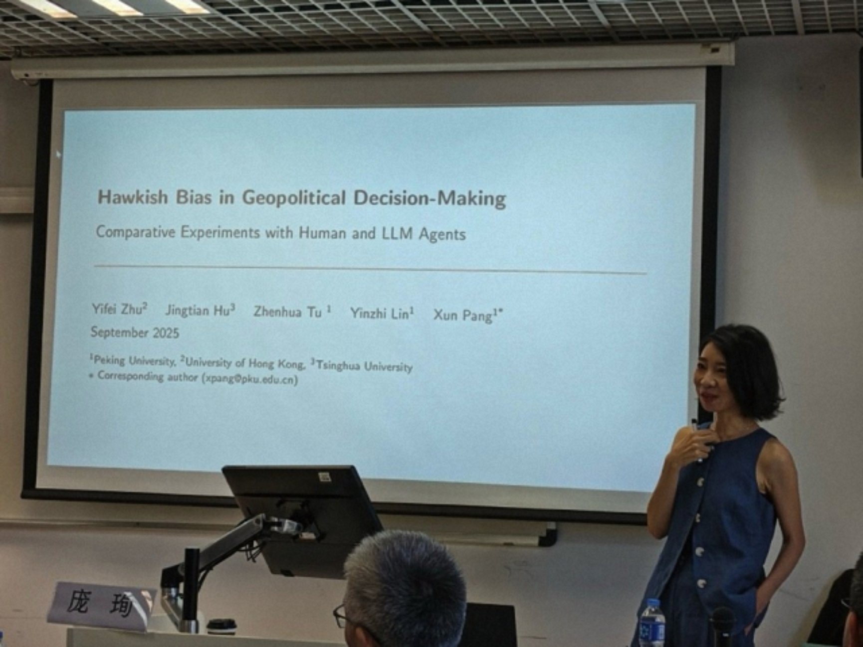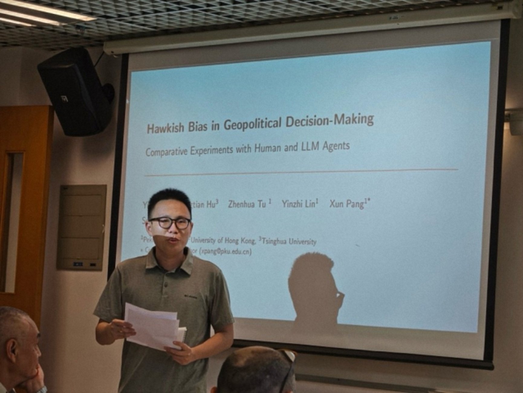 In the afternoon of September 26, Professor Pang Xun from Peking University, Director of the Global Risk Political Analysis Laboratory, gave an academic lecture titled "Hawkish Bias in Geopolitical Decision-Making: Comparative Experiments with Human and LLM Agents" at the University of Macau’s Faculty of Social Sciences. The lecture analyzed the decision-making mechanisms in international conflicts from a political psychology perspective, sparking lively discussions on geopolitical risks, diplomatic decision-making, and the application of quantitative methods in social sciences. Assistant Professor Yin Weiwen from the University of Macau chaired the seminar, and Professor Wang Yizhou from Peking University’s School of Computer Science addressed the current issues and difficulties in applying AI to social science research, which will likely be overcome as AI technology advances.