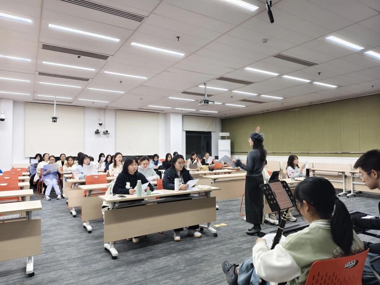“Dreaming back to that youth, persevering again and again”—a lyric repeatedly sung, and the truest portrait of rehearsal. Lead rehearsal coach Senior Student Yang Jieyu began with fundamental vocal exercises, guiding everyone patiently from the basics. From diaphragmatic breathing and breath control to vocal placement and scale warm-ups, the sounds in the classroom gradually grew from tentative to full and resonant.