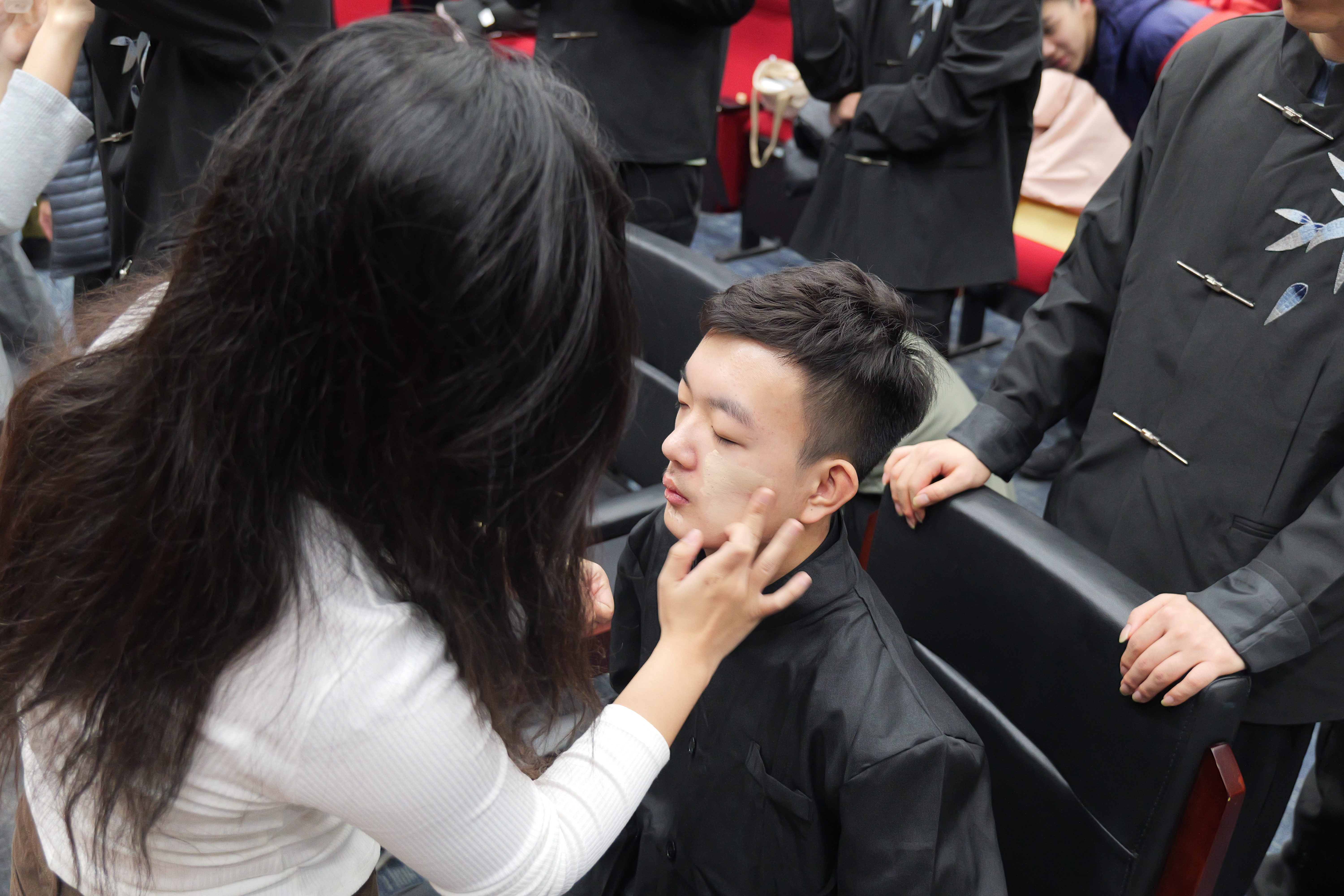 On the day of the performance, senior students came to the Qiulin Auditorium to help with makeup, offering enthusiastic support and strength.