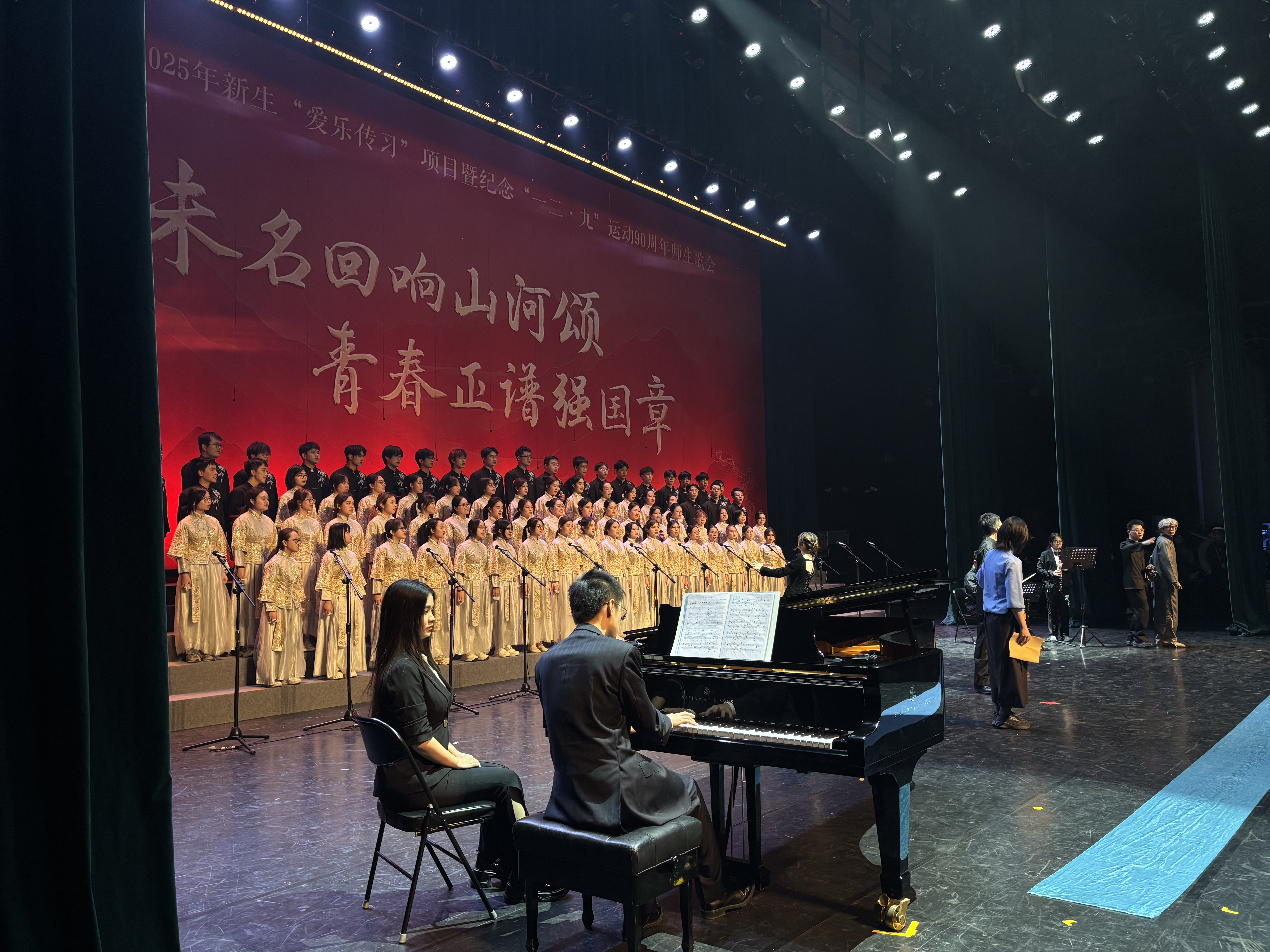 Subsequently, the four sections—soprano, alto, tenor, and bass—rehearsed separately to refine lyrics and melodies. Dance and stage drama rehearsals progressed in parallel, orderly and steady. Every rhyme and cutoff, every movement and expression, condensed shared sweat and sincere passion.