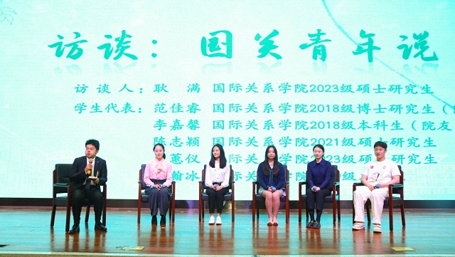 新时代的国关人大有所为,也大有可为。在国关青年访谈环节,多位国关院友、学生代表分享了他们在学习工作中的感受。在学术科研方面,范佳睿分享了论文写作的建议和对国际关系研究的认知,坚持在学术上做到精益求精、守正创新。在学生工作和志愿服务方面,陈志颖和李嘉馨分别分享了她们在担任院团委学生副书记和北京冬奥志愿者时的经历,鼓励同学们在学生工作和志愿服务中将心比心、收获成长。在文体方面,王蕙仪和赵瀚冰分别讲述了担任国关“一二·九”合唱指挥和男足队队长的经历,内化于心、外化于行是他们对国关精神的最好阐述。