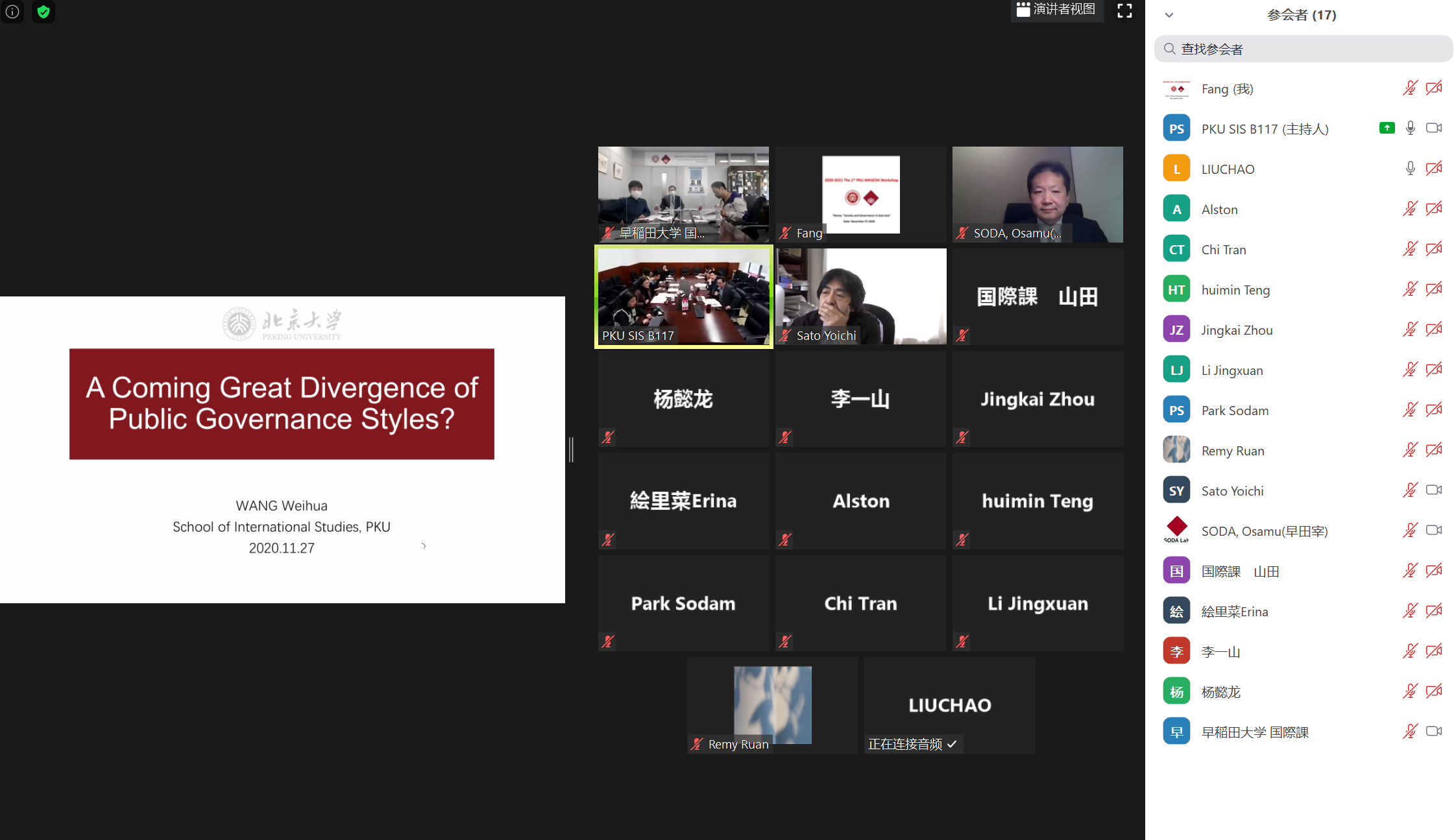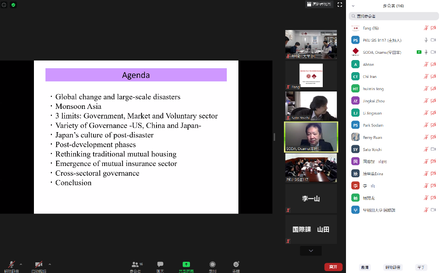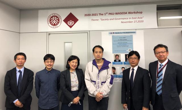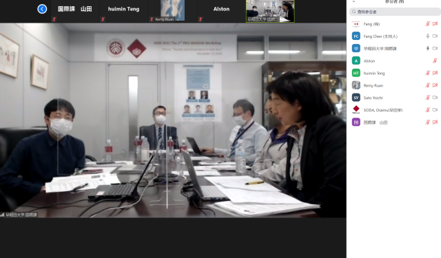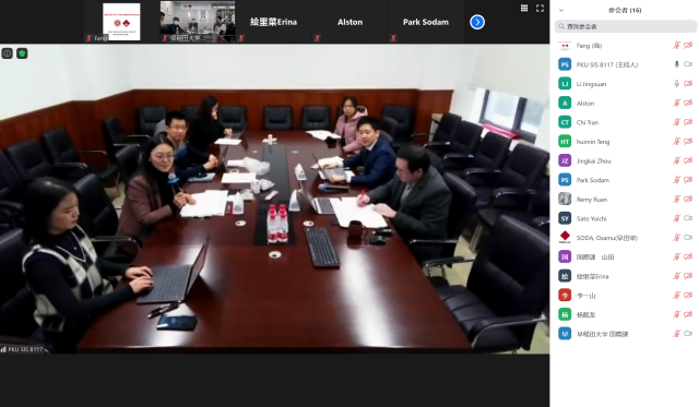 2020年11月27日上午,2020-2021年第一期北大—早大合作研究交流会在线上成功举办。本期交流会聚焦“东亚的社会与治理”这一主题,两校学者和学生围绕疫情下的国际合作、公共治理模式的分流、城市规划、危机管控等领域的问题展开了深入的研讨交流。早稻田大学社会科学学院院长早田宰教授、北京大学国际关系学院汪卫华副教授、早稻田大学社会科学学院佐藤洋一教授、早稻田大学国际部部长 Rhee Maji Christine、国际部事务部长高木范夫,以及北大和早大的二十余名线上和线下的学生参加交流会。研讨会由北京大学国际关系学院副院长董昭华主持。