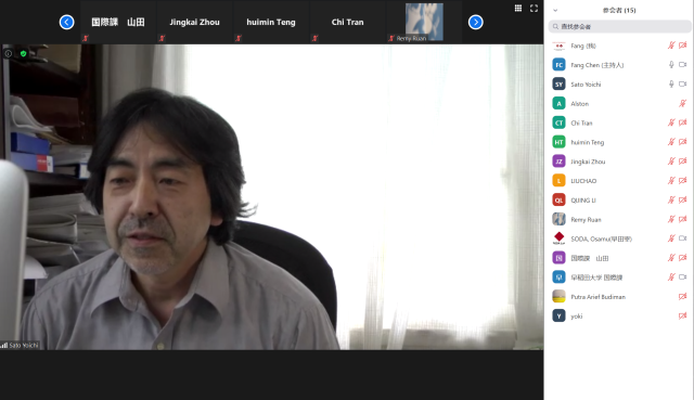 最后,来自早稻田大学社会科学学院的佐藤教授对以上五个演讲分别做了点评和提问。他指出,早田教授的演讲喻示了不同的治理模式根植于不同的历史,而关键在于如何创造未来;汪教授的演讲使他回想起在应对疫情初期,不同国家政府间的应对速度形成的鲜明对比。针对Shimizu Kenta同学的演讲,佐藤教授指出,社区治理的关键即社区中人与人之间的关系;对于安光德同学的演讲,佐藤教授肯定了跨境合作的重要性,但是教授认为如何在积极跨境合作的同时控制疫情的跨国传播,将是各国政府需要综合考量的问题。关于吴臻同学的演讲,佐藤教授指出如何评估长春殖民时期的城市治理经验,它在多大程度上能被当代的市民接受,将是未来需要思考的问题。