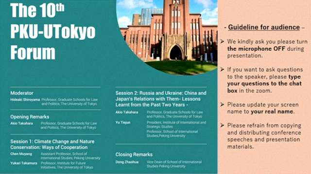 2024年1月5日上午,第十届北京大学-东京大学论坛以线上会议形式成功举办。本届论坛聚焦“气候变化与发展融资:合作路径”与“俄罗斯与乌克兰:中国和日本与俄乌的关系及过去两年的教益”主题,两校学者从国内政治、经济、气候治理及国际发展等视角出发,对上述主题展开了深入的研讨交流。北京大学战略研究院院长于铁军教授、国际关系学院副院长董昭华副教授及陈沐阳助理教授,与东京大学法政研究科城山英明教授,未来倡议研究中心高村ゆかり(Yukari Takamura)教授、公共政策大学院高原明生教授,以及来自北大和东大的三十余名学生参加了本届论坛,论坛主持人由城山英明教授担任。