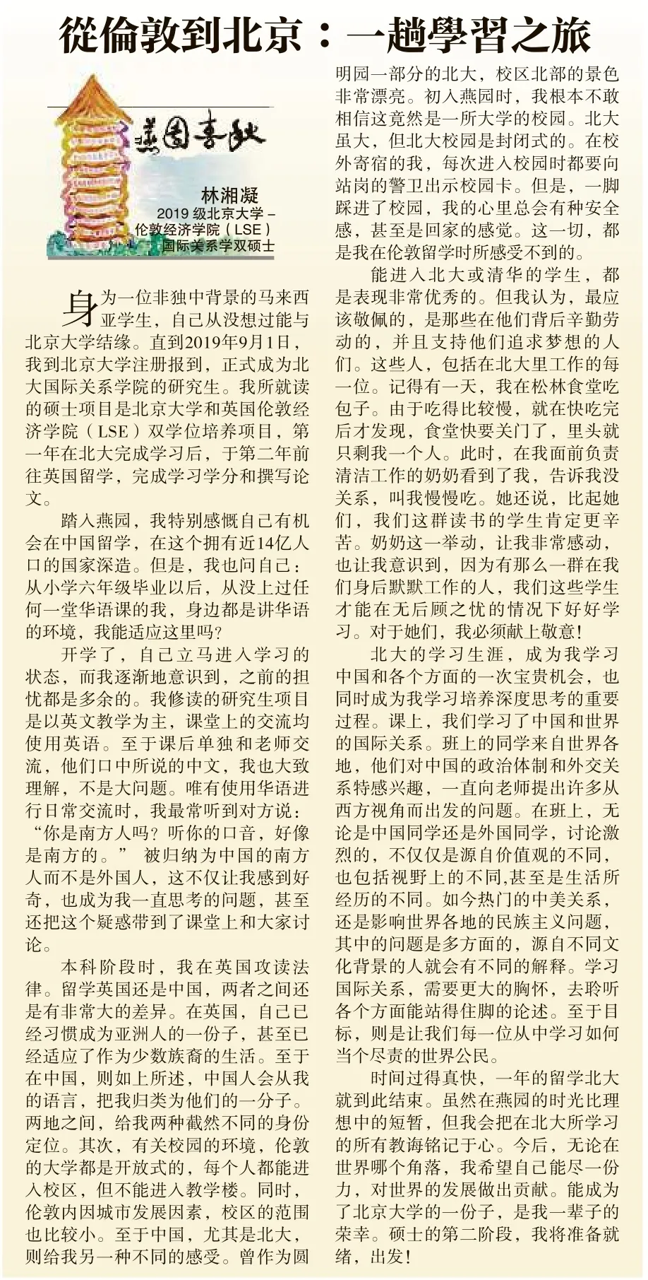 北京大学-伦敦经济学院(LSE)19级国际关系学双硕士林湘凝的《从伦敦到北京:一趟学习之旅》原文载自《星洲日报》第14页,出版日期:2020年8月2日