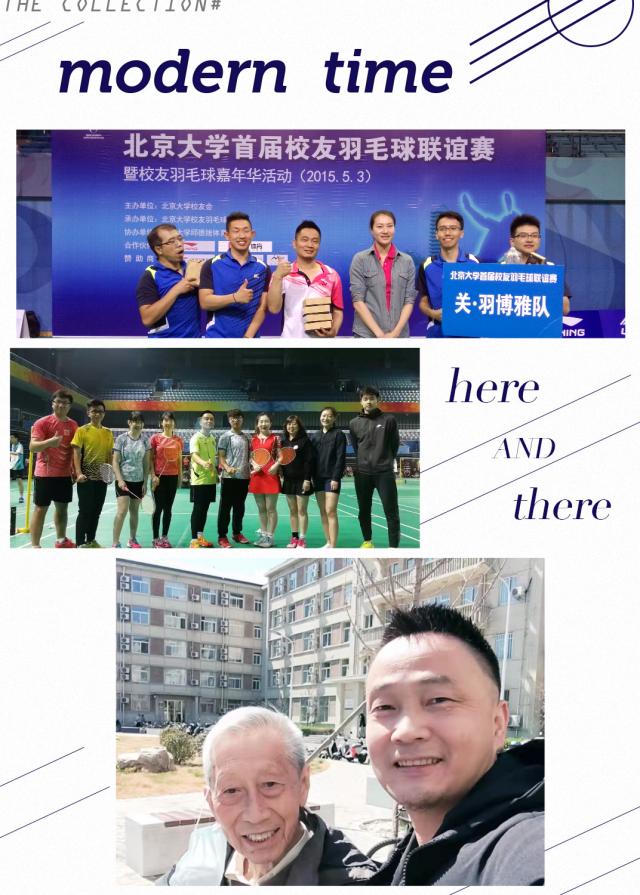 还没有邱德拔球馆的时候,李老师就已经在五四球馆打球。从最开始的一周一次,到后来一周四五次,成为球馆的常客。“那会儿学打球,我先后请教过本校梁英明老先生和其他神秘的国手前辈,梁老是印尼归国华侨、中国羽毛球名宿,可谓是把羽毛球带进中国的第一代。”李老师打球颇有气势,杀球暴力级别高,似铁匠打铁一般,人送绰号“铁哥”,凭此硬朗的球风球技,斩获过北京市高校赛教工双打冠军、武陵山脉湘鄂黔片区团体冠军、第一届北大校友赛团体冠军、北大杯冠亚军等荣誉若干。
