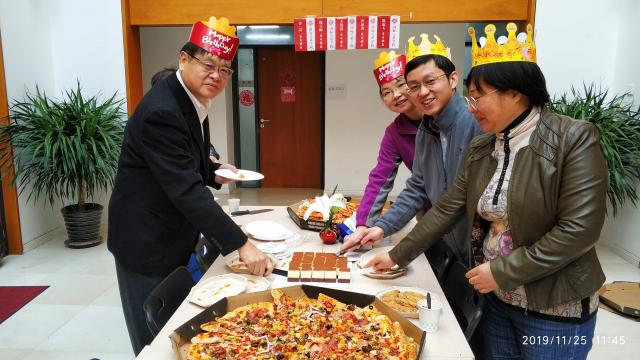 十一月份学院过生日的寿星老师一共五位,除了远在美国出差的许亮老师遗憾没有在场,其他四位寿星老师都开心得佩戴上了生日帽,在温馨的生日歌伴奏下,共同切开蛋糕,接受生日祝福,并与大家合影留念。活动现场的精美茶点也是丰富诱人,有工会老师特意预定的超大分享装披萨,刘伟老师精心冲泡的咖啡红茶,还有汪洋老师亲自烹饪的鸡汤补品,各路美食也令大家大快朵颐。