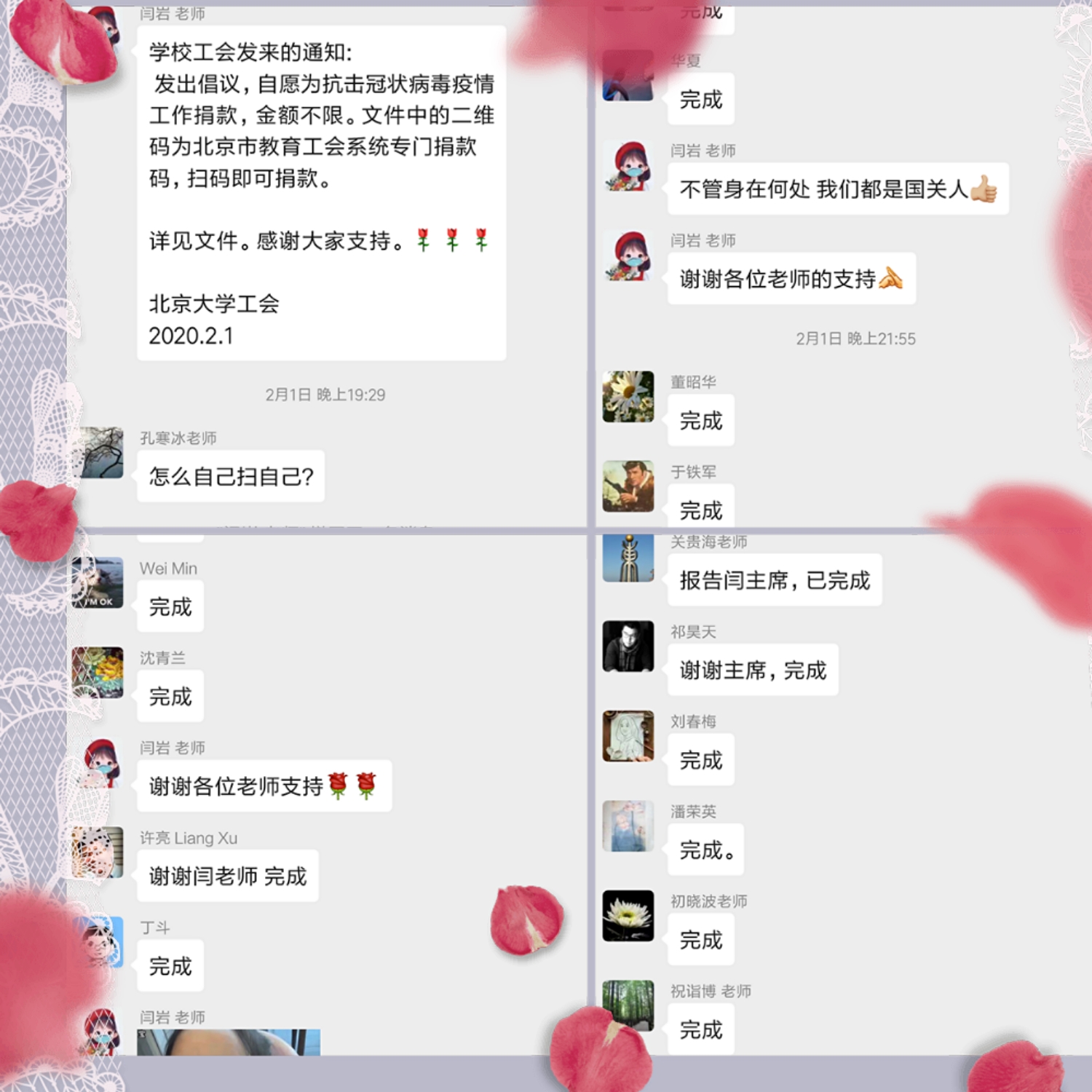 疫情爆发以来,学院工会积极反应、努力配合、时刻关注,在抗击疫情的工作上丝毫没有松懈。在工会主席闫岩老师的带领下,各位工会委员通力协作、积极配合,对学院老师各自居家和外出的动态保持时刻关注,对学院的抗疫情况尽力落实完成,协助为身在抗疫前线的老师们寄送口罩等物资,为离退休老师们提供力所能及的帮助,时刻关注学校和学院的各类通知,及时上传下达最新的抗疫信息,为所有教师送上一份温暖和关爱。疫情终会过去,春天终会到来,相信待到大家重回校园的时刻,将会更加珍惜这份得来不易的相聚,也会更加感恩有我们患难与共的工会集体和组织,更会加倍努力奋斗,建设我们深爱的美丽燕园大家庭。