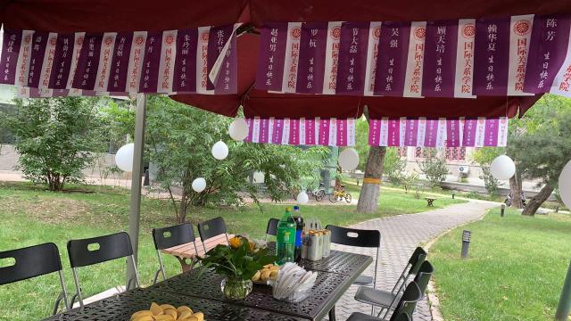 午间十分,秋高气爽,在学院工会主席闫岩老师、副主席霍艳丽老师,工会生活委员汪洋老师,工会成员刘伟老师的精心布置下,国关后院草坪被装点出一片节日的氛围,红色遮阳棚下整齐地摆放着一排桌椅,上面摆放着诱人的生日蛋糕 、鲜花、水果和饮品。遮阳棚的周围张贴着工会特意为大家制作的生日彩旗、气球和飘带,彩旗上悬挂着各位过生日老师的姓名,在阳光的照耀下,熠熠生辉。学院咖啡厅还准备了印有每位教师姓名的咖啡杯,作为教师节的礼物和咖啡厅十周年的纪念,赠送给各位老师。