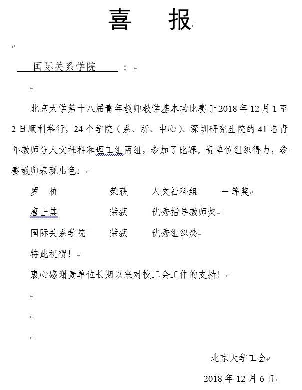 国际关系学院教师代表罗杭老师,凭借扎实的基本功和出色的发挥,一举夺得人文社科组一等奖,唐士其院长荣获“优秀指导教师奖”,学院工会在闫岩老师的精心组织和踊跃参与下,获得“优秀组织奖”。