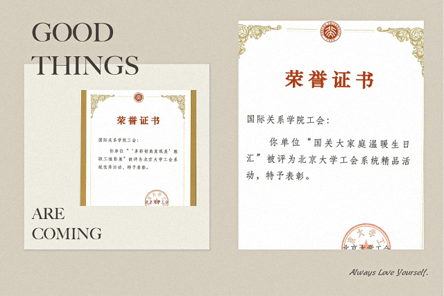 荣誉代表过去,代表学院工会的工作受到学校的肯定。今后,国际关系学院工会将继续秉持“开拓进取,服务学院发展,创新国关温馨大家庭”的理念,积极动脑筋想办法,不忘初心、牢记使命,珍惜荣誉、再创辉煌,在学院和谐发展和工会建设中做出应有的贡献。