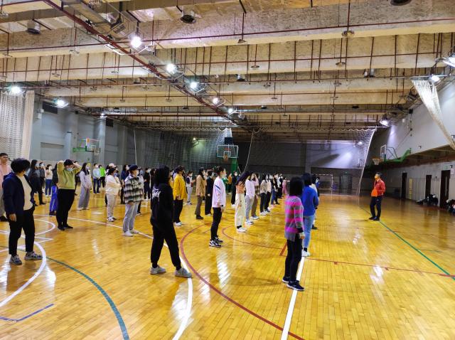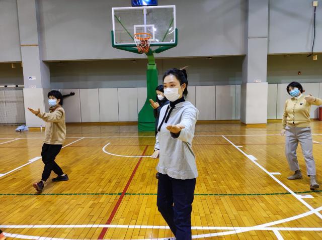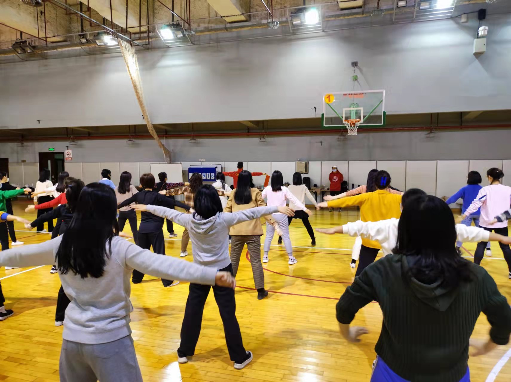 两位老师牺牲了个人午休的时间,积极参加培训学习。她们通过实地表演培训和线上视频学习的方式,基本掌握了排练曲目《红旗颂》的表演动作,为下一步开展学院教师团体操的培训做好了准备。