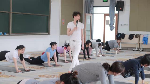 午间一个小时的瑜伽运动,充分缓解了国关学院教职工久坐电脑前备课上课的辛苦与疲惫。瑜伽老师还专门针对高校教师职业特点,精心为设计了肩颈、手腕、腰椎放松和舒展拉伸的瑜伽体式,他从日常的呼吸和走路姿势讲起,从简单的站立到盘坐,行走到直立,讲授姿态和形体对个人气质的重要性,带领大家渐渐走进舒缓放松却又颇具挑战的瑜伽世界。