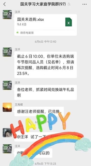 2022年6月6日,北大国关工会会员们收到了一则温馨提示,学院工会提醒尚未领取端午节礼品的老师,在6月8日及时领取端午好礼。收到提醒的老师们,感谢学院工会的贴心提醒,并就兑换端午节礼品的相关问题向工会委员汪洋老师进行了咨询。