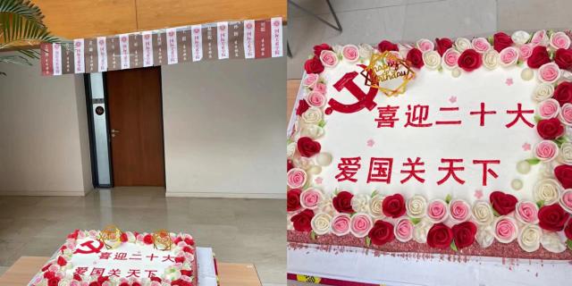 10月17日清晨,喜迎二十大的热烈氛围就围绕在国关学院A座大厅的上空,教职工们还在热烈地讨论着昨天收听收看二十大报告的场景,细心地老师就发现了学院的新变化。A座大厅周围张贴出了带有教师姓名的生日彩旗和五彩气球,大厅正中心摆出一个制作精美的方形蛋糕。上面用红色大字写着“喜迎二十大 爱国关天下”。蛋糕的左上方鲜艳的党徽熠熠生辉,围绕着党旗周围,点缀满了红色粉色的玫瑰花朵,仿佛置身于一片花的海洋。这个巨大的生日蛋糕,引来许多路过的老师驻足拍照,大家忍不住激动又喜悦的心情,纷纷表示,“蛋糕诱人啊,大家一定要来参加!”,都迫不及待地期待着中午生日汇快点开始。