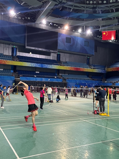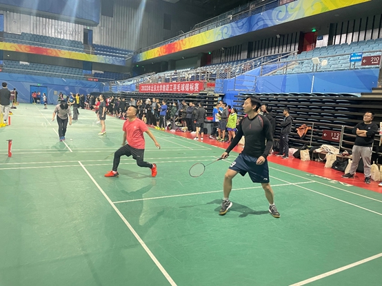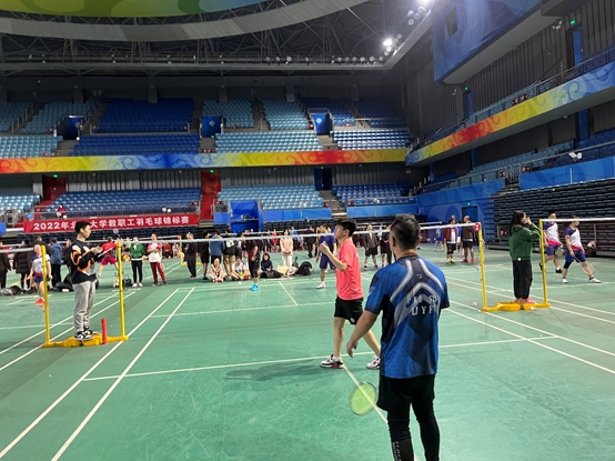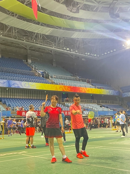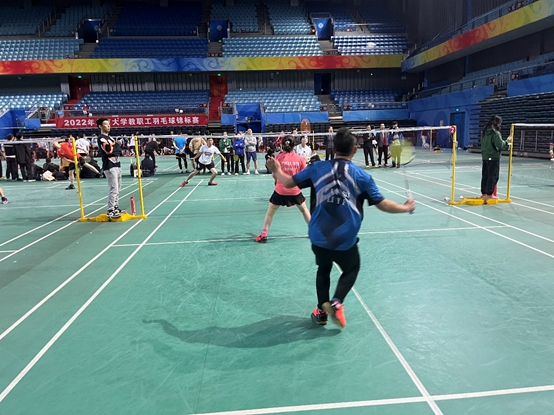 我院羽毛球队今年在乙组,共有55支队伍,光看队伍数量之多便可知晋级路上困难重重。幸好被分到了只有三支队伍的第十五组,而每组的前二名都可以出线并进入淘汰赛,属实是个好签。然而,国关教工羽毛球队并不会满足于出线这种基础目标,况且以第一名的身份出线的话淘汰赛就会对上其他小组的第二名,众队员自然是一开始就马力全开。初战在1日17:30开始,对手是教发一队,闫岩老师、曹宝萍老师以过硬的实力和丰富的经验撑起女选手半壁江山,闫老师不断左右调动对手,曹老师一直在前场封网,不到十分钟便大比分获得胜利。此时,完全料不到女双会以迅雷不及掩耳之势获胜的男双队员吕晓宇老师还在比赛场外漫步。只见裁判不断呼喊男双上场且李扬帆老师急忙高喊“晓宇人呢?打电话给他啊!”,幸好吕老师在被取消资格之前赶到场上。