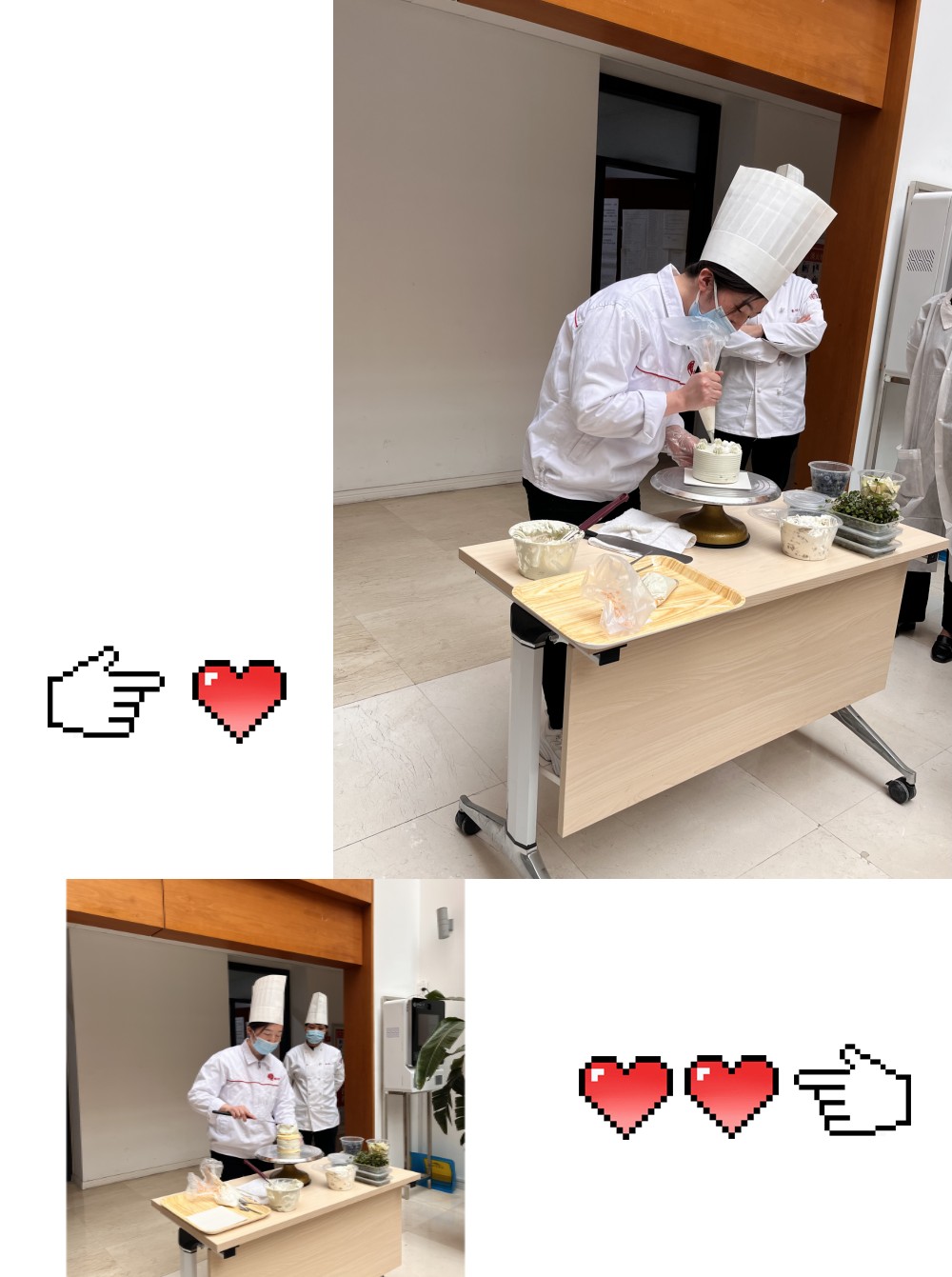 下午两点,甜蜜蛋糕制作活动准时开始。首先,小北面包房的西点师傅讲解蛋糕制作的步骤和技巧,然后亲自示范了一个蛋糕制作的完整过程。师傅一边用心制作,一边细致讲解,参加活动的女老师们也听得专心致志、聚精会神。