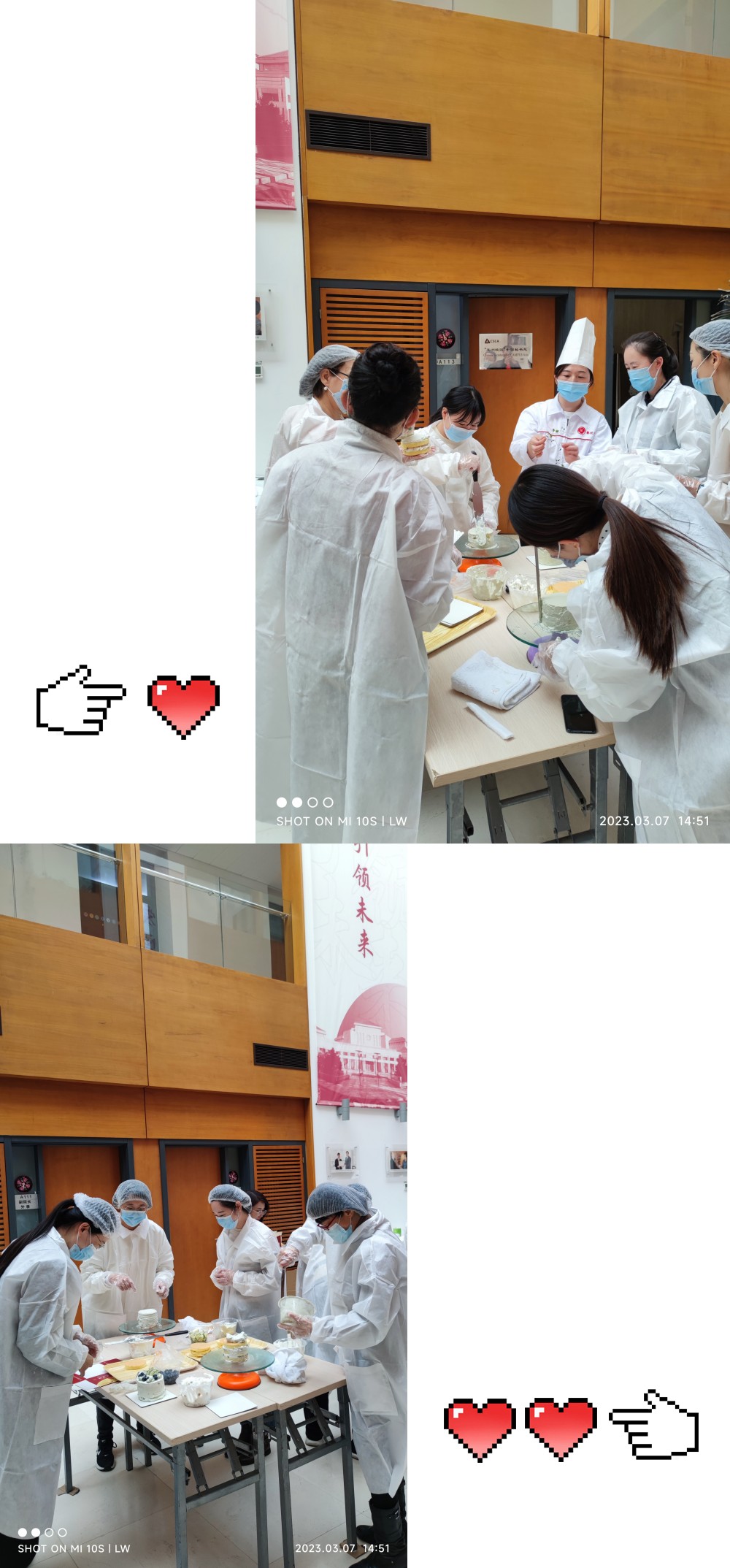 紧接着,国关学院的老师们也跃跃欲试,大家亲自动手,制作属于自己的甜蜜蛋糕礼物。有些老师参加了去年的蛋糕制作工坊,算是蛋糕工坊的高级学员,大家信手拈来,熟练的开始涂抹奶油和搭配装饰。也有部分老师是第一次尝试制作,她们谨小慎微,不敢有半点马虎,时不时地还虚心向面点师傅请教,不一会儿,她们也变身成为蛋糕达人,制作出了精美别致的蛋糕甜品。