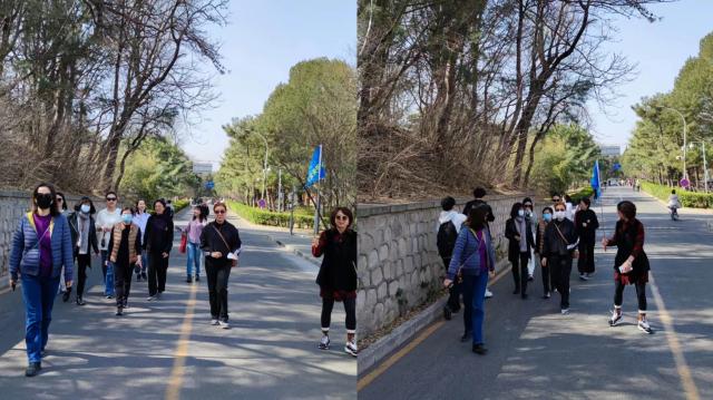 中午11点45分,国关学院的女教师们就准时在学院门口集合,大家朝气蓬勃、意气风发。工会主席闫岩老师手举着国关学院蓝色小旗帜,在三月初春的微风里,轻舞飞扬着。老师们身着休闲运动装,迈着轻快的步伐,由学院走向活动七点老生物楼。