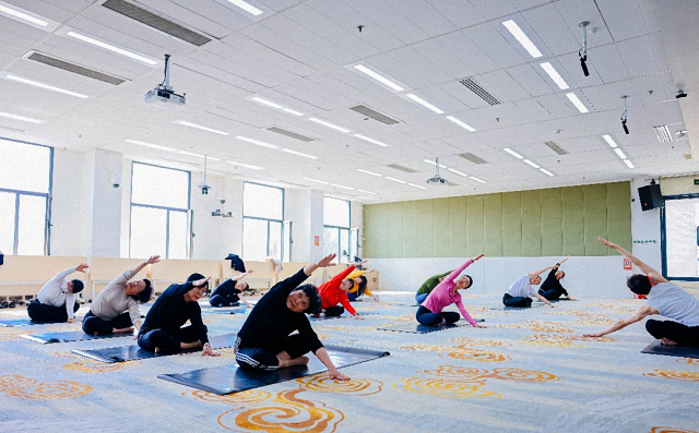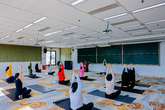 在瑜伽老师的带领下,老师们放松身心、舒展身体,充分感受到瑜伽运动带来的快乐与健康。