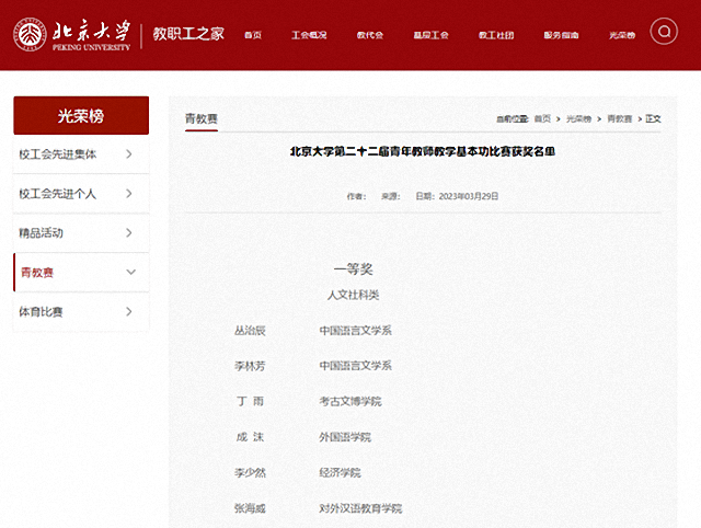 2023年3月29日,北京大学工会发布了北京大学第二十二届青年教师教学基本功比赛结果和获奖名单,国际关系学院青年教师参赛代表赖华夏老师因其出色的发挥和优异的表现,不辱使命,一举为学院斩获人文社科类二等奖和优秀教案奖2项大奖,特此祝贺,并对学院所有参与和支持青年教师教学基本功比赛的老师表示感谢。