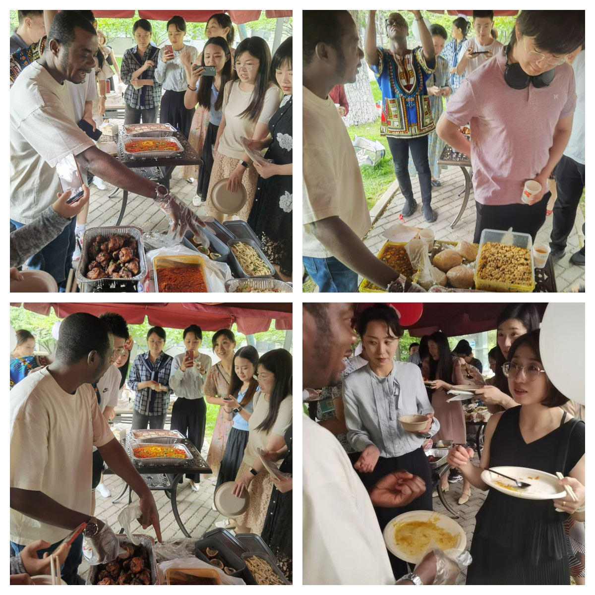 中午时分,学院老师和同学们走出教室,聚集到后花园,丰富多彩的美食盛会让大家目不暇接、流连忘返。学院非洲研究中心邀请了来自加纳和尼日利亚的留学生代表,带来他们国家独居特色的非洲美食,熟悉的生日会瞬间化身成为了一场“国际美食节”。