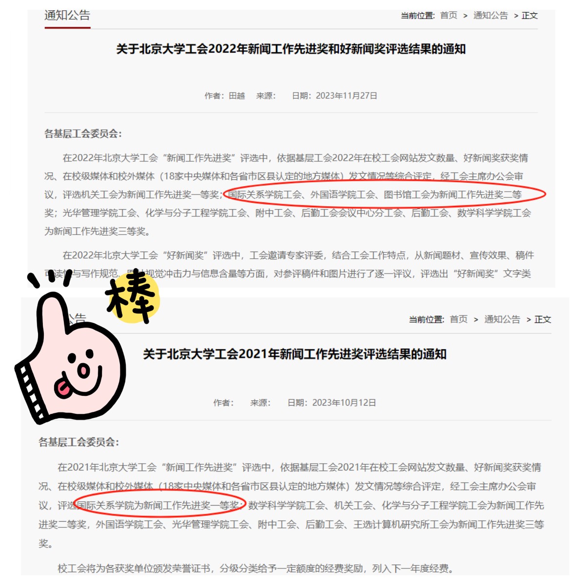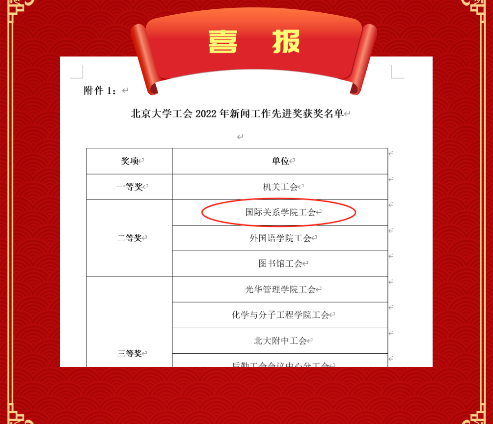 11月27日,北京大学工会发布了“关于北京大学工会2022年新闻工作先进奖和好新闻奖评选结果的通知”,依据基层工会2022年在校工会网站发文数量、好新闻奖获奖情况、在校级媒体和校外媒体(18家中央媒体和各省市区县认定的地方媒体)发文情况等综合评定,经工会主席办公会审议,国际关系学院工会获得新闻工作先进奖二等奖。这也是继2021年获得新闻工作先进奖一等奖以来,国关学院工会连续两年获此殊荣。