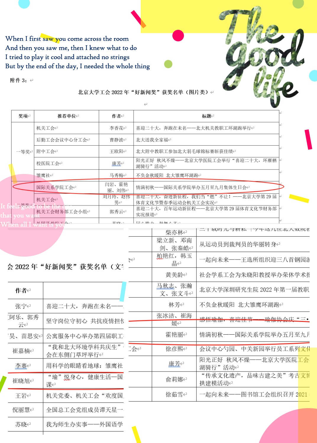 除此之外,国关学院工会还有四名老师在2022年北京大学工会“好新闻奖”评选中获奖,她们分别是霍艳丽老师、闫岩老师、刘伟老师、崔晓旭老师。霍艳丽老师、闫岩老师、刘伟老师的图片稿件《情满初秋——国际关系学院举办五月至九月集体生日会》分别获得图片类二等奖和文字类三等奖,崔晓旭老师的《瑜悦身心,健康生活—国关学院工会教职工午间瑜伽课堂顺利开课》获得文字类二等奖。