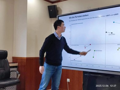 接着,卢晓老师汇报了自己的参赛准备并试讲,他准备参赛的内容为《欧洲联盟概论》课程中的《德国政党联盟》一节。