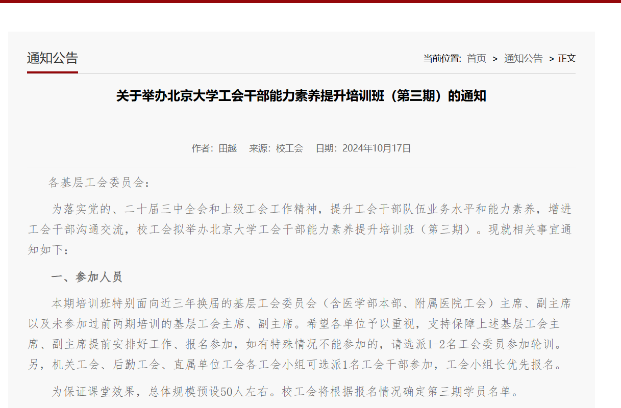10月底,北京大学工会发布了第三期工会干部培训班的报名通知,号召各基层工会积极推荐干部参加培训活动,提升工会干部业务水平和能力素养,促进全校工会干部沟通和交流。